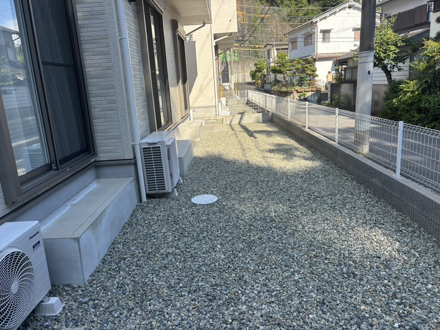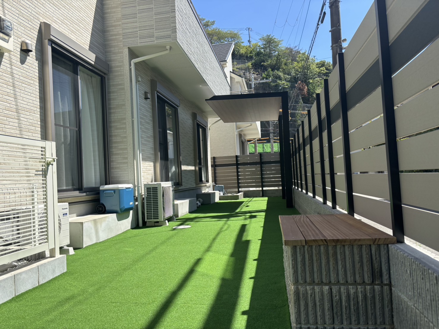 砂利の庭を人工芝にしたい、フェンスもオシャレな物に変えたい、窓の前に屋根を付けたいとご依頼をいただきました。 犬を飼っておられたので、ドッグランにもなる丈の短い人工芝を採用し、フェンスも木彫で一本違う色の板を入れる事で独自性のあるオシャレなフェンスに仕上げました。 窓の前の屋根は人気の高いLIXILのテラスSCを施工しました。 全体的にオシャレで快適な空間へと変貌させる事が出来ました! 費用 約200万円