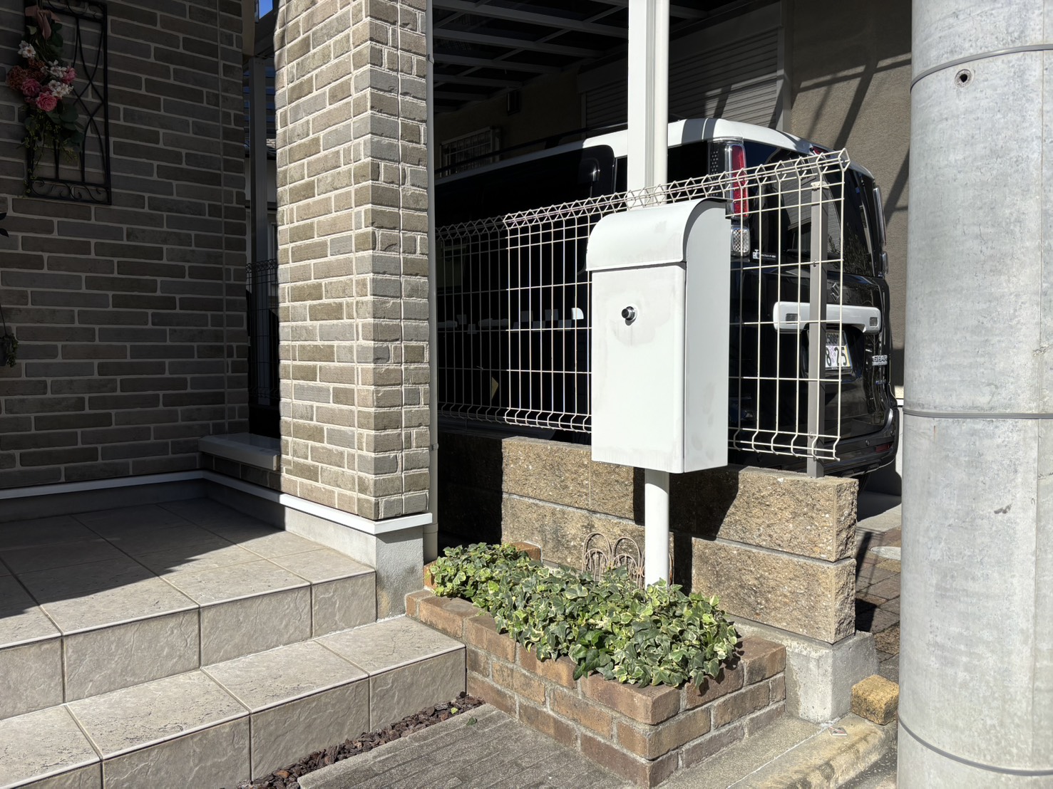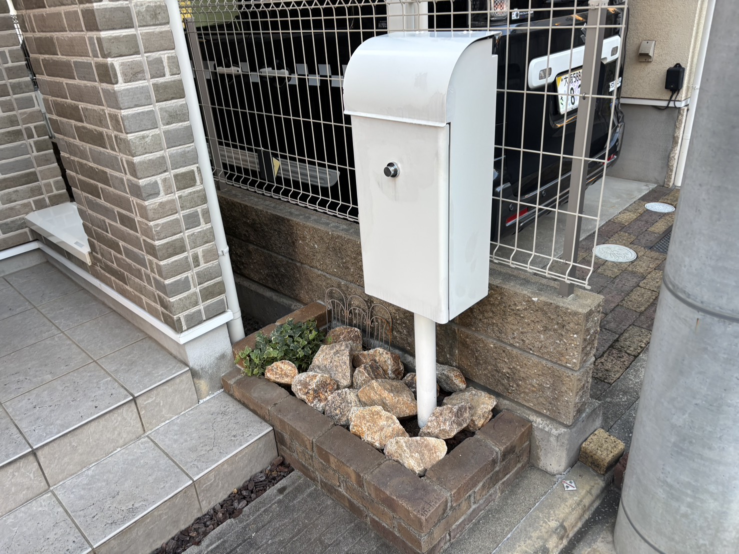 使っていないレンガの花壇を土の部分を無くし、椅子のように座れるようにしたい、 また、ポスト周りのアイビーを一部取り除き石を使ってオシャレにしたいとご要望いただきました。 費用 約7万円